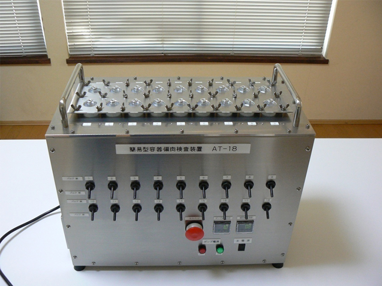 吸引ポンプを用いて容器内の空気を吸い出し、その時の容器の変形状態を観察(肉圧に偏りがあると薄い部分が凹む)できる様な装置を製作。吸引圧力は任意に設定でき、吸引圧力が設定値に到達すると自動的に吸引ポンプが停止。