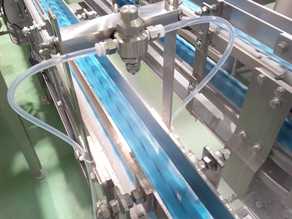 次工程に容器を搬送しながら洗浄できる様、搬送コンベア上にミスト噴霧器及びエアノズルを取り付けた。