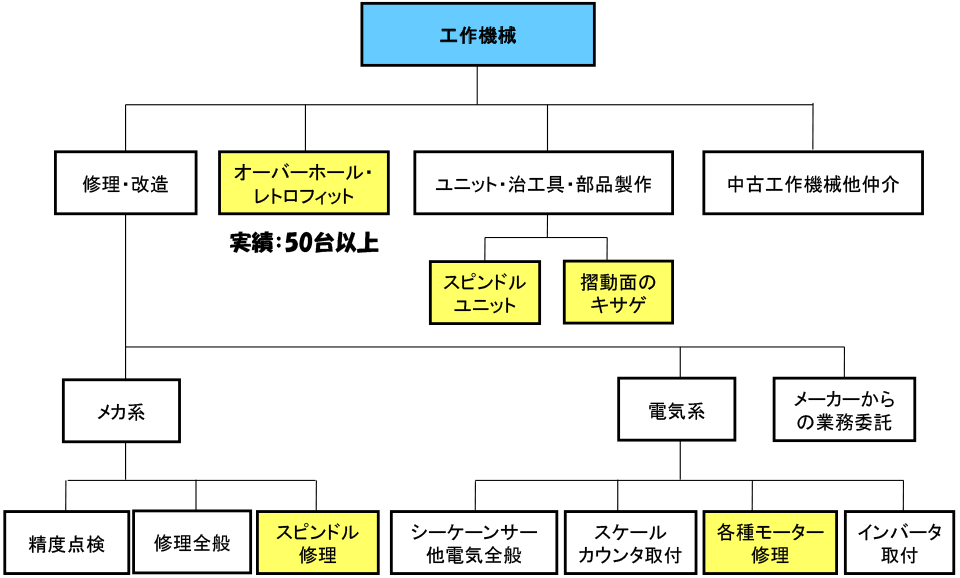 工作機械Groupでは「工作機械のオーバーホール、レトロフィット」、「摺動面のキサゲ作業」、「工作機械の修理、精度点検」などを得意としております。